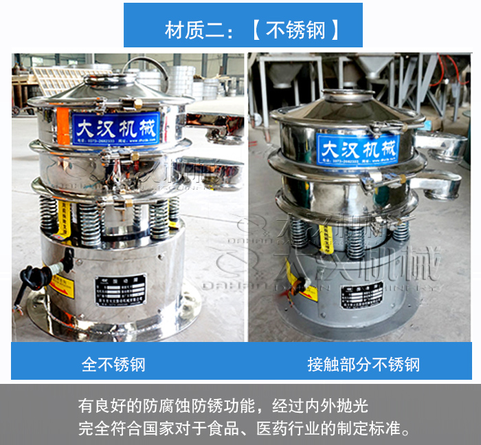 不銹鋼振動(dòng)篩的結(jié)構(gòu)主要是【1.全不銹鋼;2.不銹鋼+碳鋼(與物料接觸部分為不銹鋼)】接觸物料為不銹鋼材質(zhì)的振動(dòng)篩主要是物料對(duì)接觸的設(shè)備材質(zhì)有所要求,防止物料與碳鋼接觸對(duì)物料進(jìn)行污染;全不銹鋼振動(dòng)篩是主要針對(duì)食品、醫(yī)藥等行業(yè),其使用環(huán)境要求嚴(yán)格,容易對(duì)設(shè)備進(jìn)行清理。具有良好的防腐蝕防銹功能,經(jīng)過內(nèi)外拋光后的304不銹鋼表面光滑無毛刺現(xiàn)象,完全符合國家對(duì)于食品、醫(yī)藥行業(yè)的制定標(biāo)準(zhǔn)。