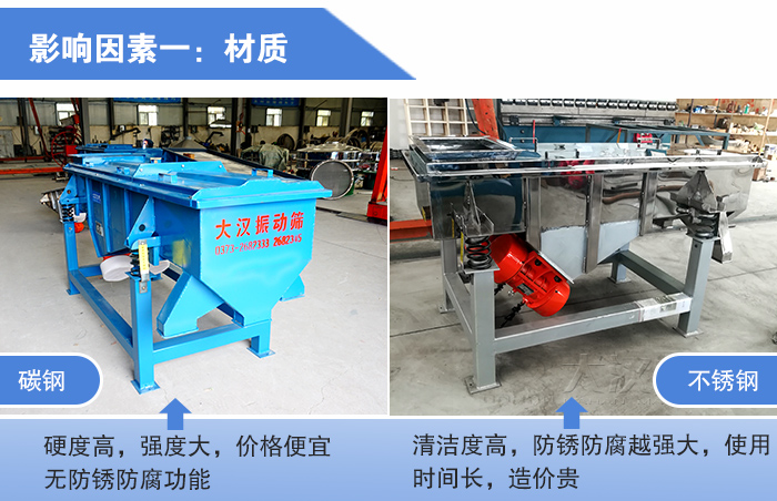 直線篩材質(zhì)分為碳鋼和不銹鋼兩種,碳鋼材質(zhì)(如:Q235)它的硬度高,強(qiáng)度大,價(jià)格便宜,是多行業(yè)常用的材質(zhì),但是它沒有防銹防腐功能,所以對(duì)于衛(wèi)生環(huán)境要求較高的就推薦您使用不銹鋼材質(zhì)(如:304)它的材質(zhì)清潔度高,防銹防腐越強(qiáng)大,不會(huì)污染物料,使用時(shí)間長,造價(jià)也相對(duì)高,所以在夠買的時(shí)候您也要根據(jù)成本預(yù)算來進(jìn)行選擇。