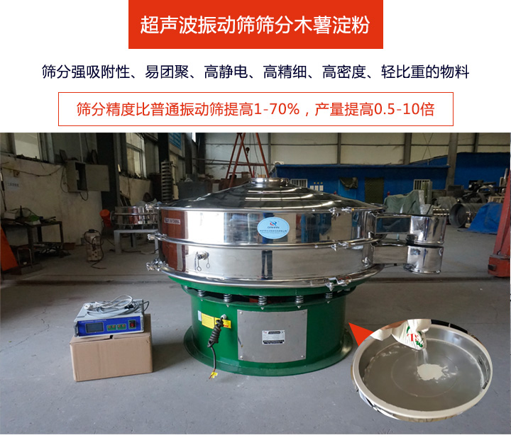超聲波振動篩相當(dāng)于升級版的旋振篩,因加入超聲波篩分系統(tǒng),它可以解決精細(xì)粉末因強吸附性、易團(tuán)聚、高靜電、高精細(xì)、高密度、輕比重等篩分問題,尤其適合木薯淀粉的篩分。超聲波振動篩篩分效率高、不堵網(wǎng),篩分精度比普通振動篩可提高1-70%,產(chǎn)量可提高0.5-10倍,可單層使用,也可多層使用。